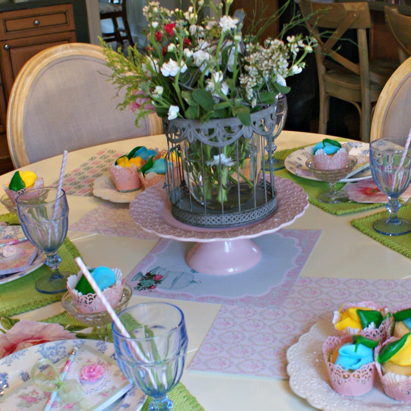 I asked her beforehand if it was acceptable for me to decorate, and she was all for that. So I gathered fresh spring flowers to fill birdcages from Michael's. Pink roses highlight this centerpiece.